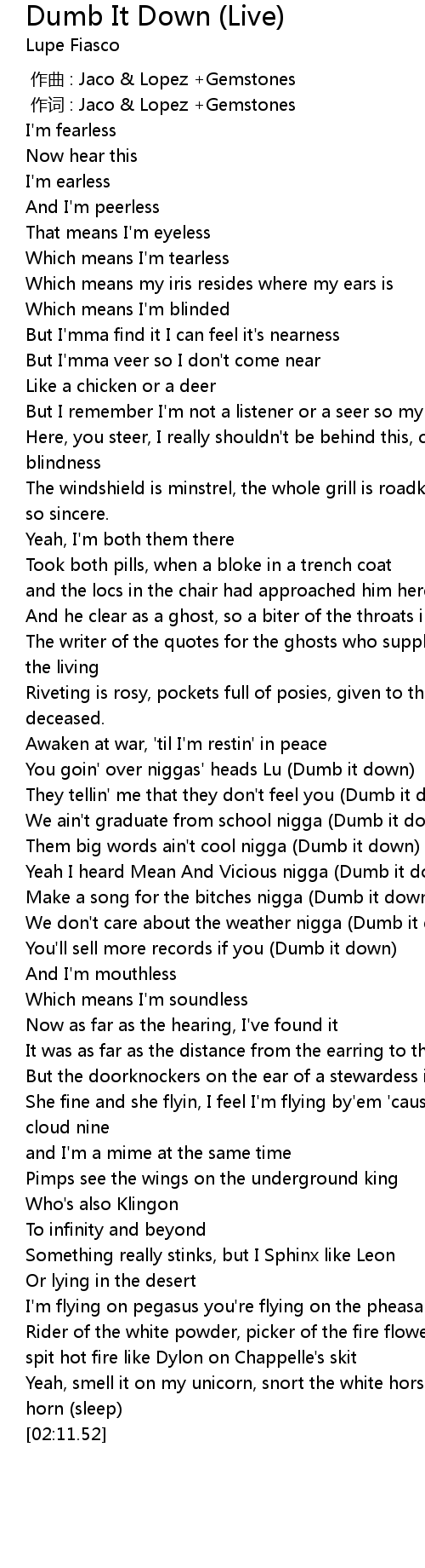 | [01:18.52] | Make a song for the bitches nigga (Dumb it down) |