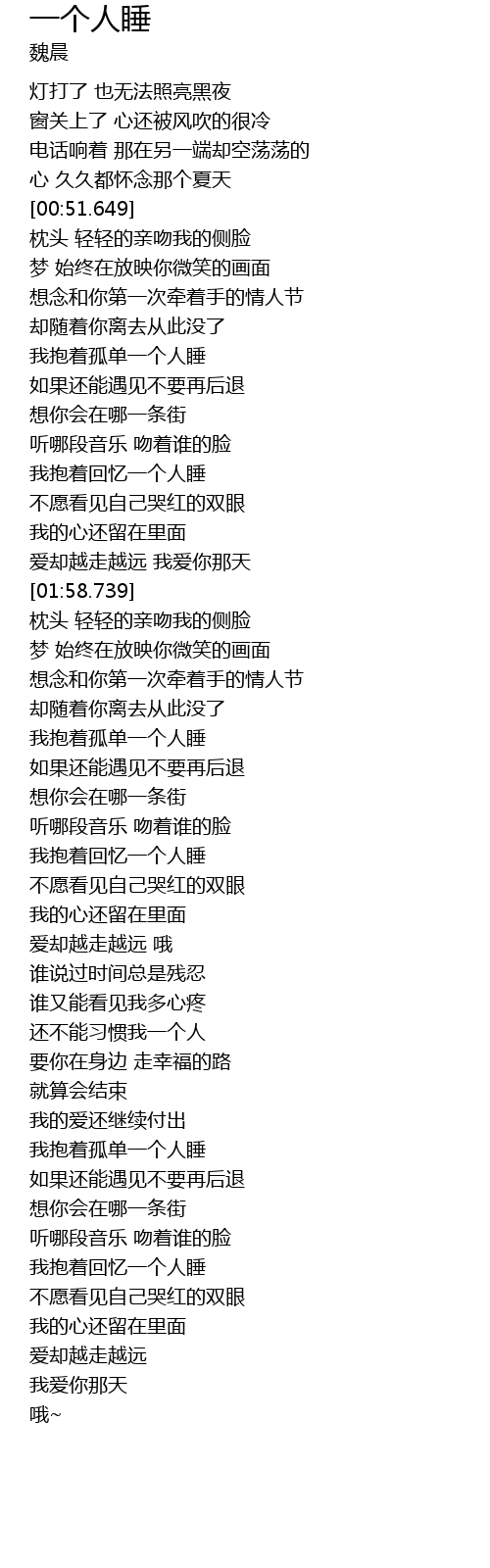 | [01:21.469] | 我抱着孤单一个人睡 |