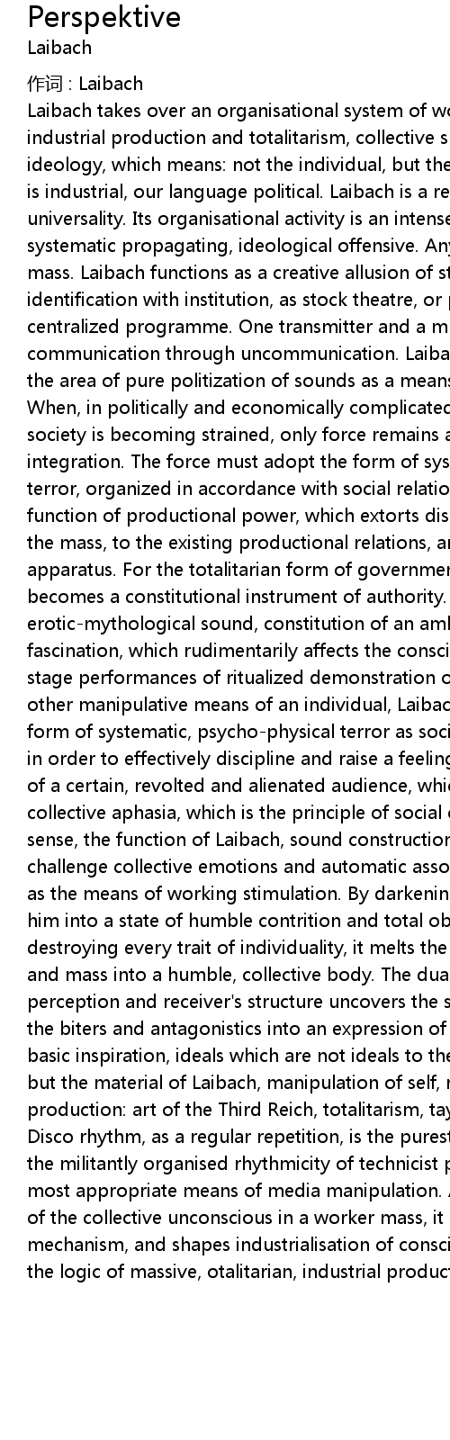 | but the material of Laibach, manipulation of self, remains an industrial production: art of the Third Reich, totalitarism, taylorism, bruitism, disco. Disco rhythm, as a regular repetition, is the purest, the most radical form of the militantly organised rhythmicity of technicist production, and as such the most appropriate means of media manipulation. As an archetypal structural basis of the collective unconscious in a worker mass, it stimulates automatic mechanism, and shapes industrialisation of consciousness, which is necessary in the logic of massive, otalitarian, industrial production. |
