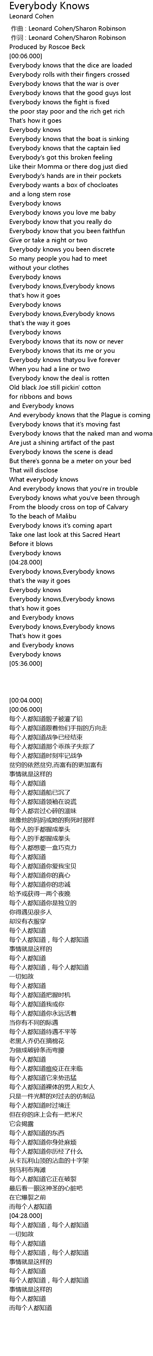 | [05:07.000] | Everybody knows,Everybody knows |
