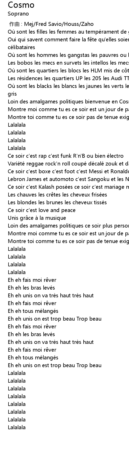 | [02:22.72] | Eh eh unis on est trop beau Trop beau |