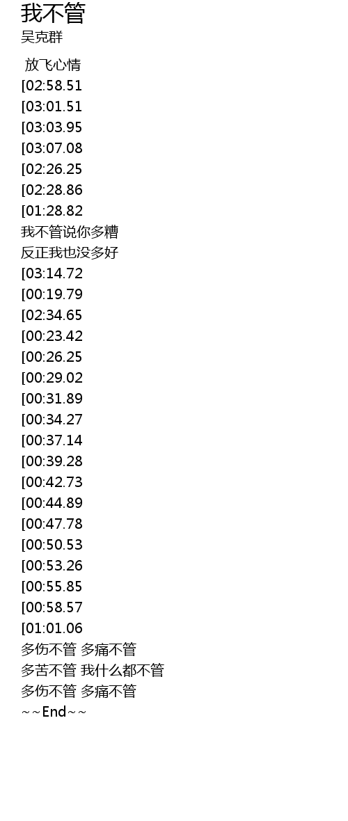 | [03:20.04][02:58.51][02:15.36][01:05.36][00:00.56] | wo bu guan bie ren shuo ni shen me |