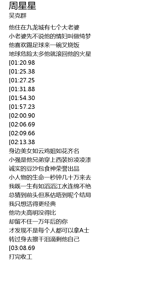 | [00:55.40][02:06.69][02:51.66] | 他名叫周星星这就是他的命 |