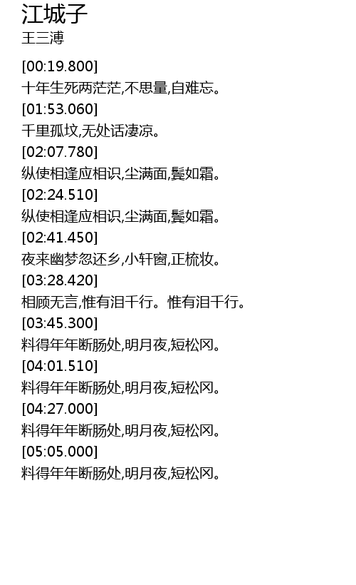 | [05:06.520] | 料得年年断肠处,明月夜,短松冈。 |