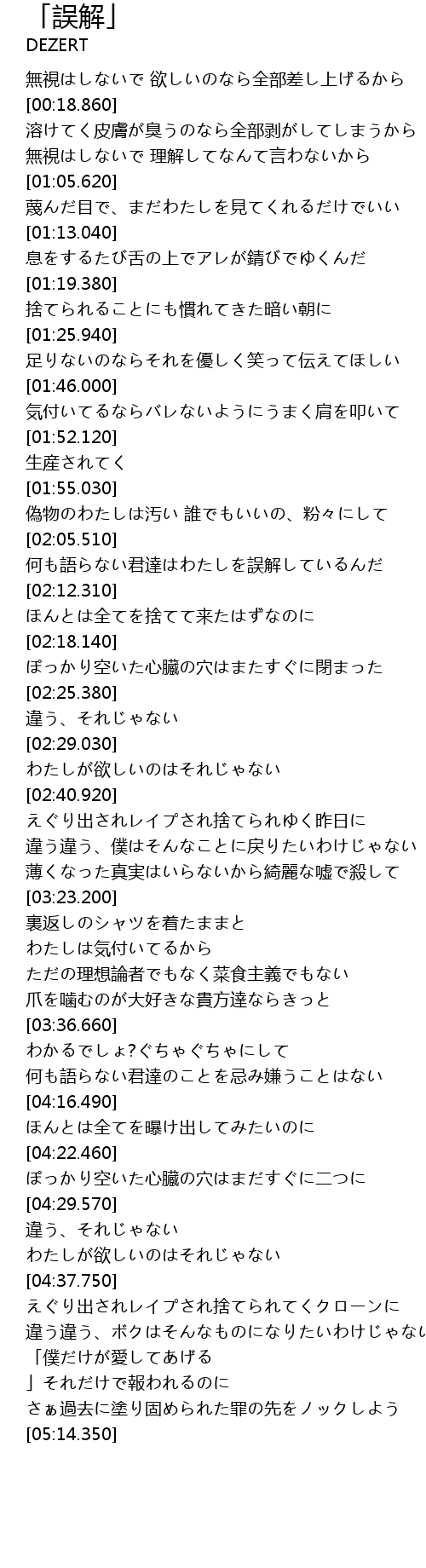 | [02:05.880] | 何も語らない君達はわたしを誤解しているんだ |