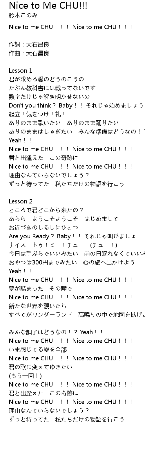 | [01:50.000] | ナイス!トゥ!ミー!チュー!(チュー!) |