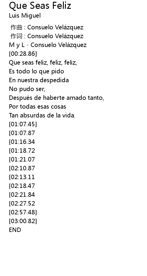 | [02:40.56][02:21.84][01:37.78] | Quiero que seas feliz, feliz, feliz |
