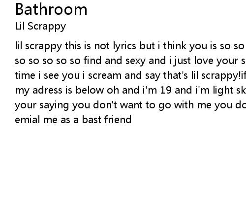| lil scrappy this is not lyrics but i think you is so so so so so so so so so so so so so so so find and sexy and i just love your songs i have your cd every time i see you i scream and say that's lil scrappy!if you have the time email me my adress is below oh and i'm 19 and i'm light skin i have long long hair i know your saying you don't want to go with me you don't even know me but please just emial me as a bast friend |