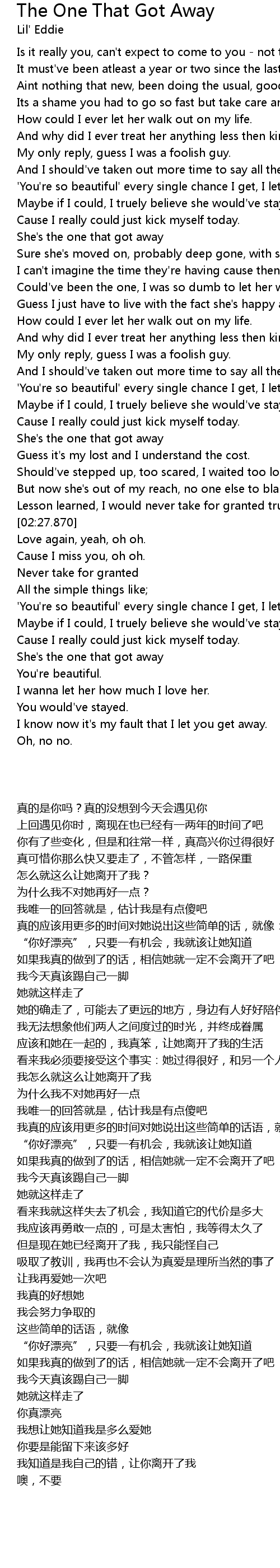 | [02:59.915] | She' s the one that got away |