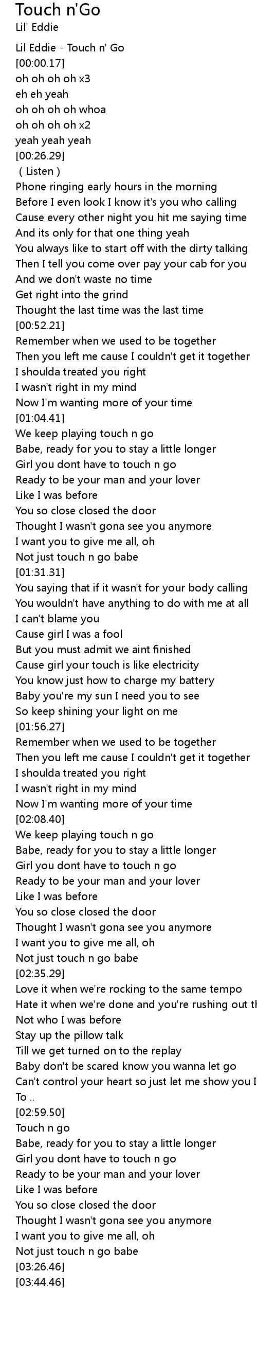 | [03:06.21] | Girl you dont have to touch n go |