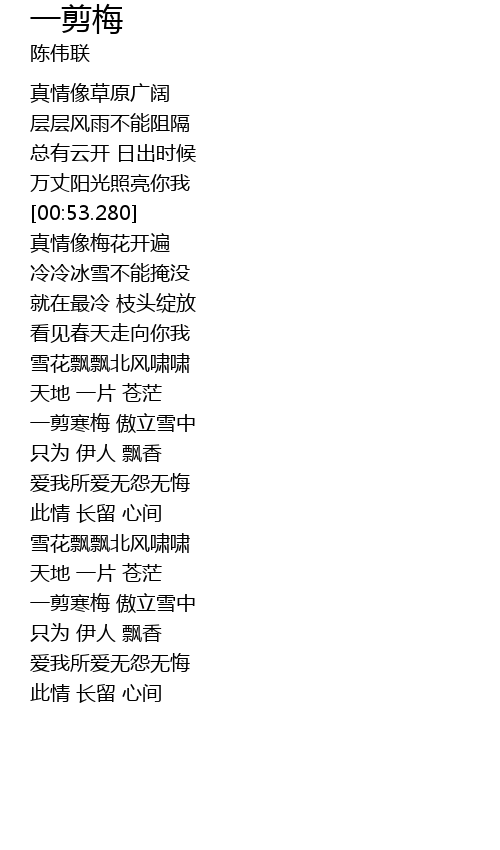 | [02:51.430] | 一剪寒梅 傲立雪中 |