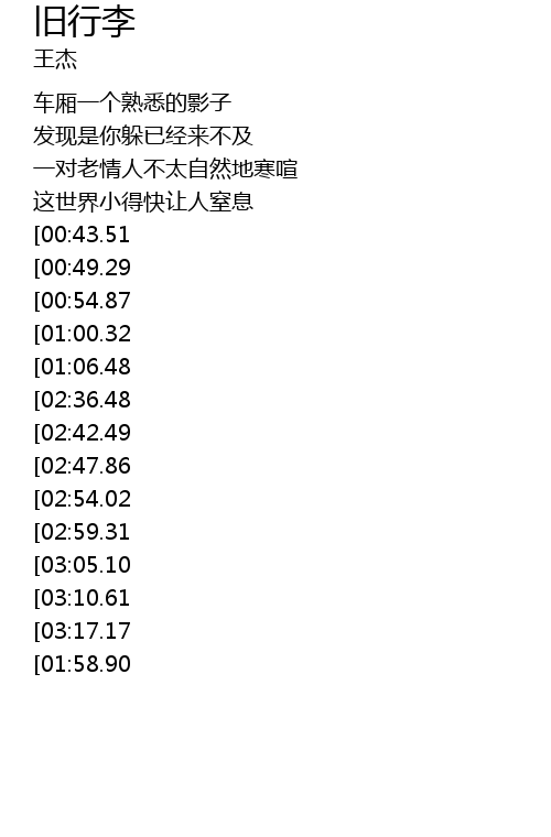 | [03:44.92][02:36.48][01:10.40] | 原来你是我还没遗失的旧行李 |