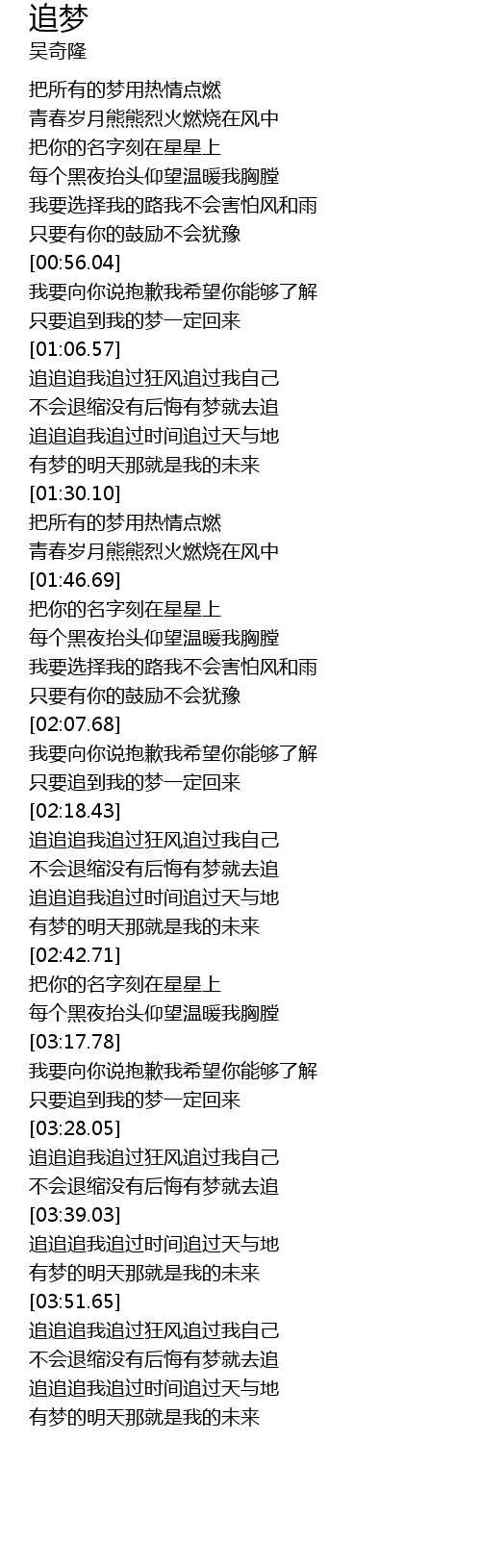 | [03:55.40] | zhuī zhuī zhuī wǒ zhuī guò kuáng fēng zhuī guò wǒ zì jǐ |