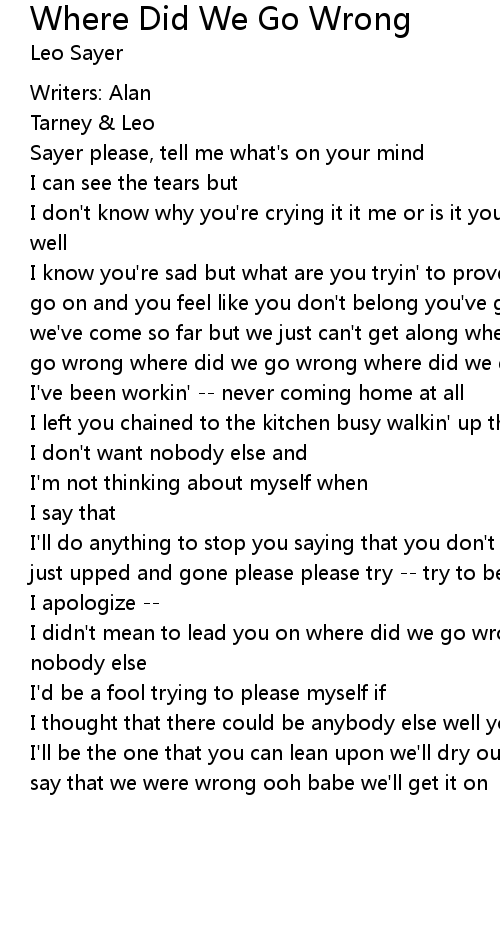I know you're sad but what are you tryin' to prove when you say that you can't go on and you feel like you don't belong you've got nobody to lean upon it seems we've come so far but we just can't get along where did we go wrong where did we go wrong where did we go wrong where did we go wrong |