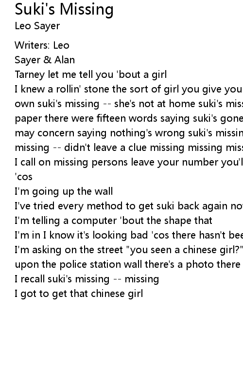 I knew a rollin' stone the sort of girl you give your lifetime to but you never own suki's missing -- she's not at home suki's missing -- address unknown on the paper there were fifteen words saying suki's gone a scribbled line to whom it may concern saying nothing's wrong suki's missing -- told a lie or two suki's missing -- didn't leave a clue missing missing missing |