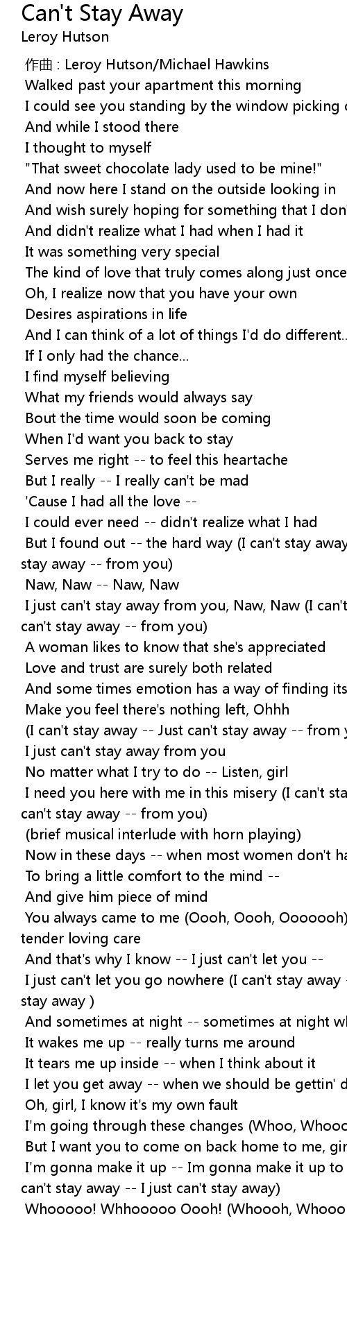 | [02:45.658] | I just can't stay away from you, Naw, Naw (I can't stay away -- Just can't stay away -- from you) |