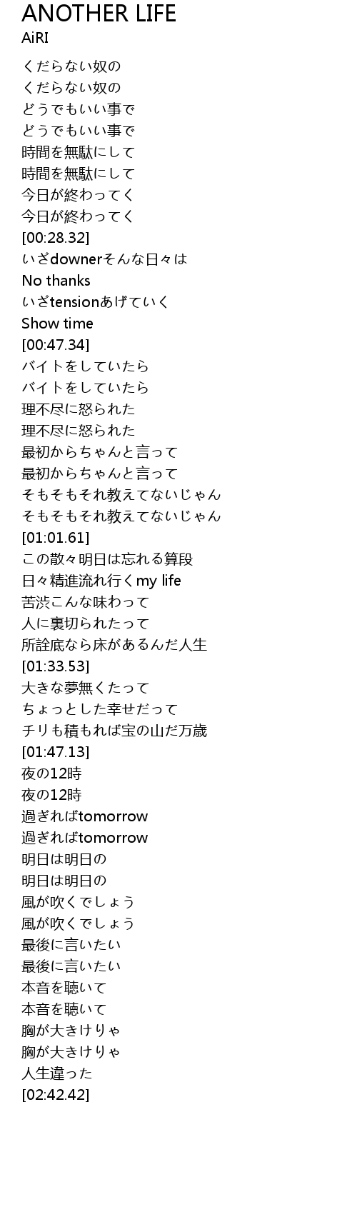 | [02:22.54] | 過ぎればtomorrow |