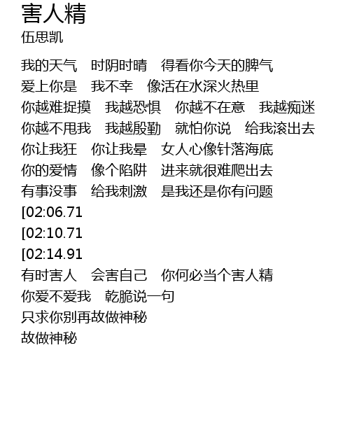 | [00:30.53] | 我的天气 时阴时晴 得看你今天的脾气 |