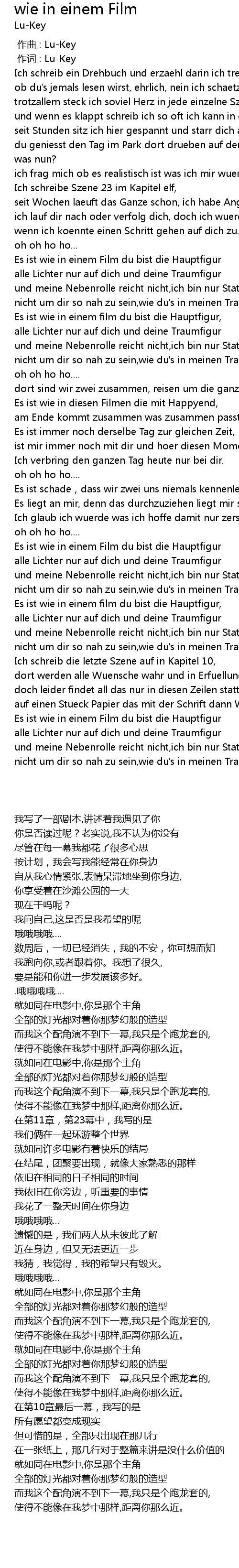 | [00:15.440] | Ich schreib ein Drehbuch und erzaehl darin ich treffe dich, |