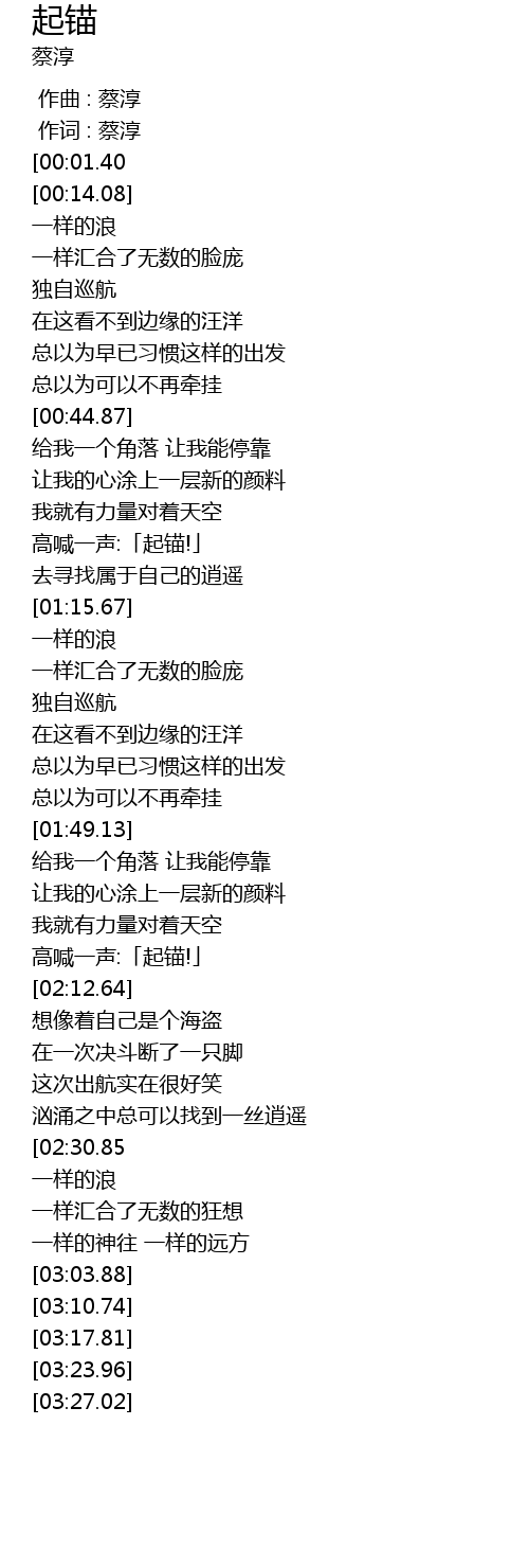 | [02:33.33][00:01.40] | 蔡淳-起锚 (出发续集) |