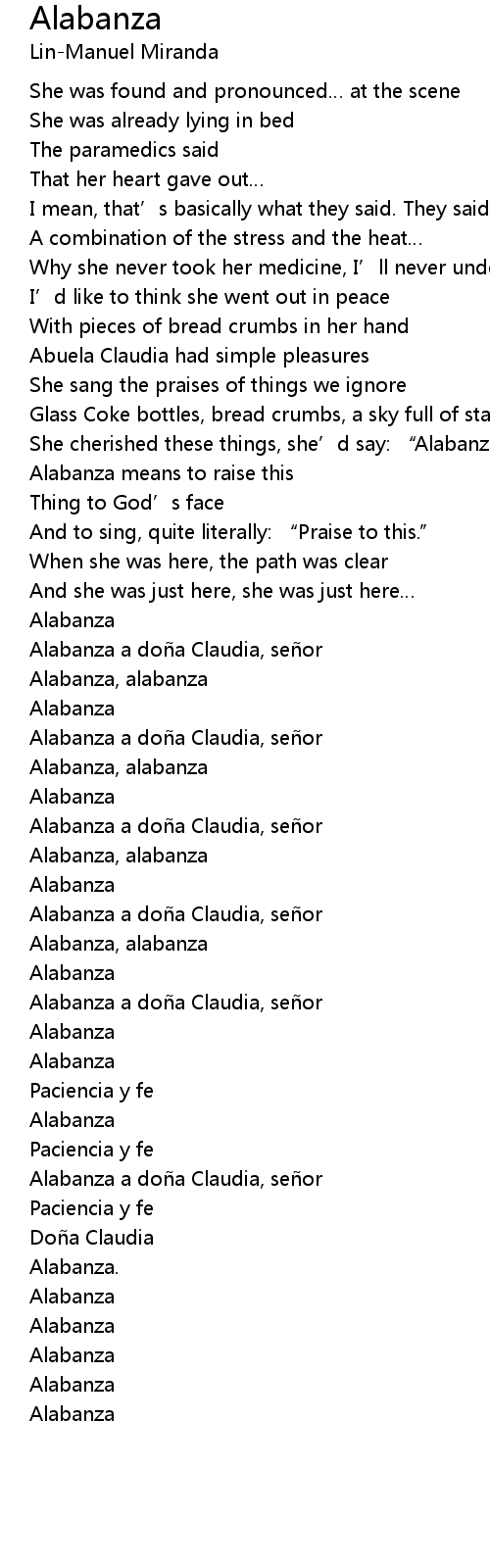 | [00:52.45] | She cherished these things, she' d say: " Alabanza." |