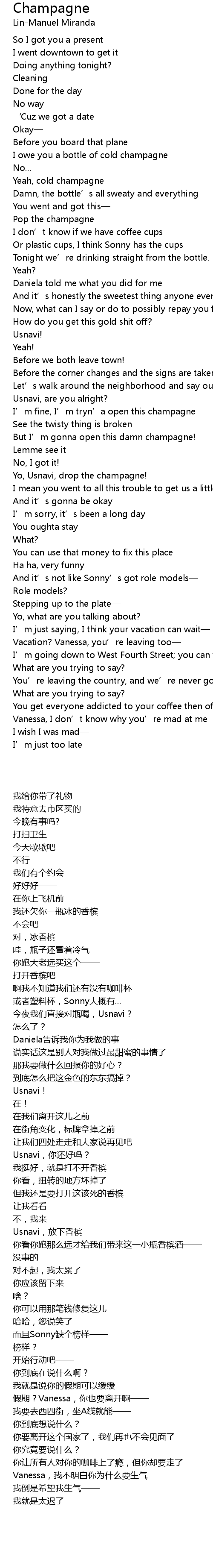 | [01:32.15] | Yo, Usnavi, drop the champagne! |