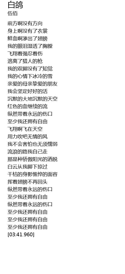 | [03:30.380] | zhì shǎo wǒ hái yōng yǒu zì yóu |