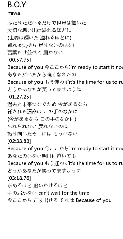 | [03:41.56] | 今ここから 走り出せる それは Because of you |