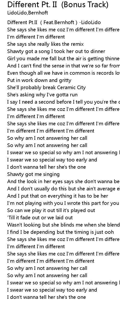 | [00:00.11] | Different Pt. II Feat. Bernhoft LidoLido |