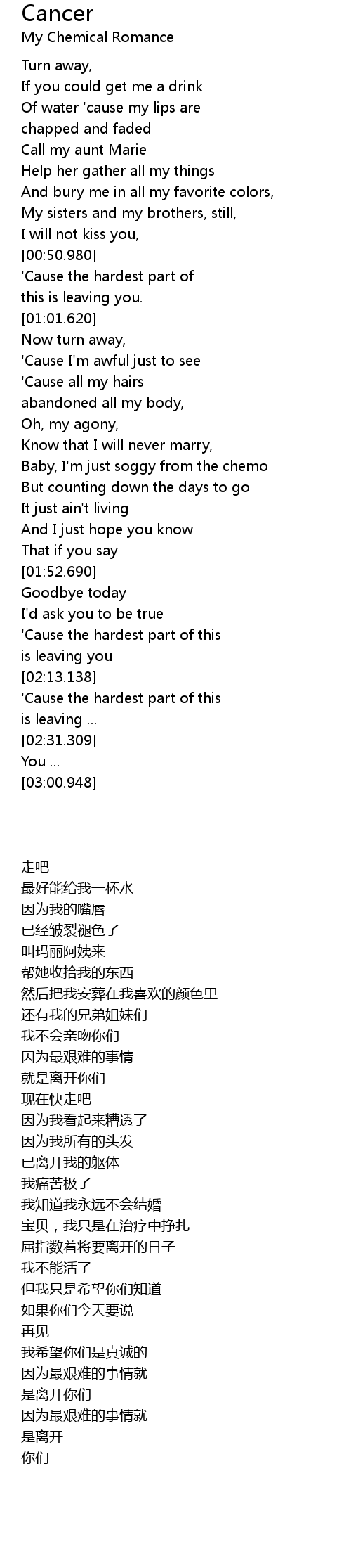 | [01:34.128] | Baby, I' m just soggy from the chemo |