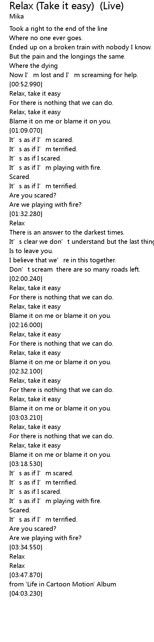 | [01:01.400] | Relax, take it easy |