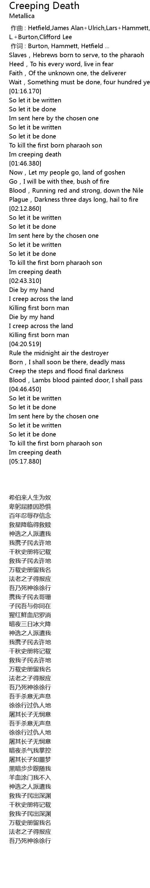 | [00:00.00] | zuò qǔ : Hetfield, James Alan Ulrich, Lars Hammett, Kirk L. Burton, Clifford Lee |