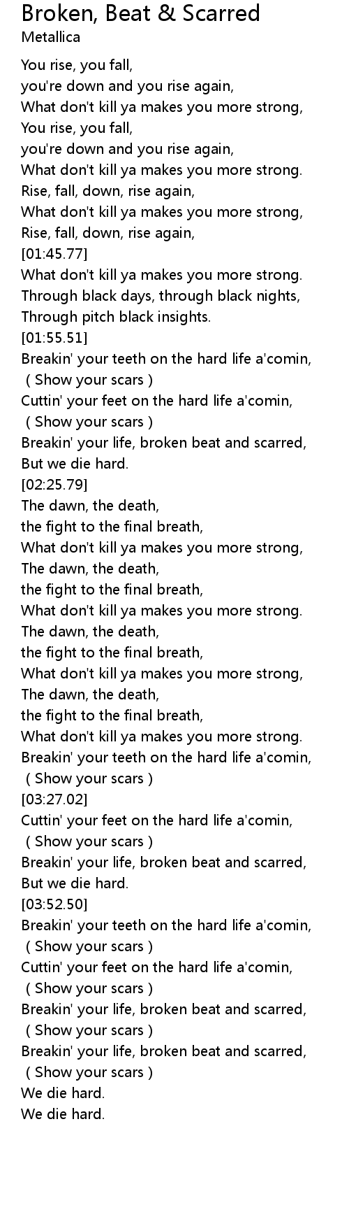 | [05:35.33] | Breakin' your life, broken beat and scarred, |