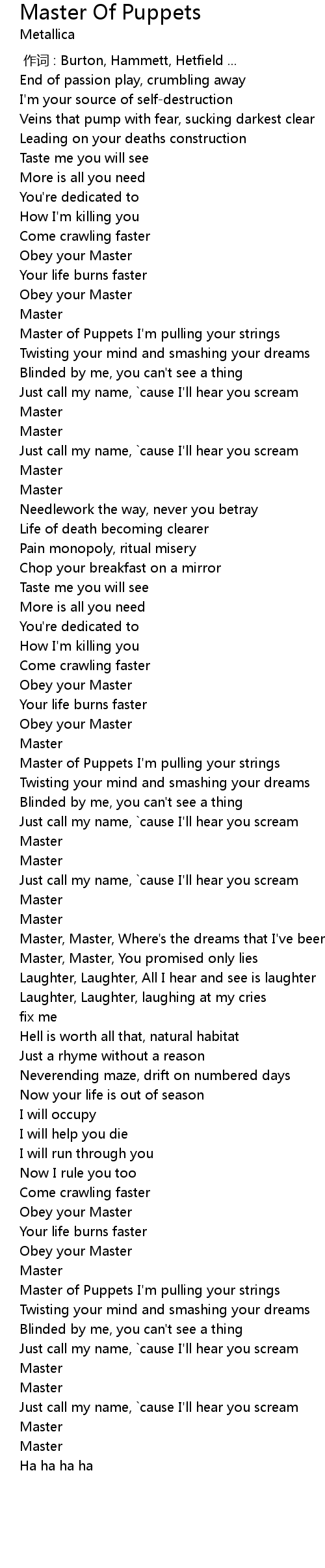 | [01:50.350] | Master of Puppets I'm pulling your strings |