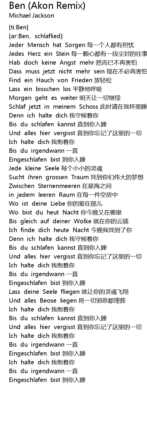 | [01:40.257] | Bis du schlafen kannst zhi dao ni ru shui |