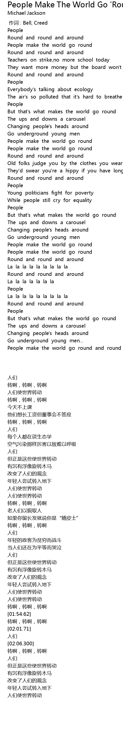 | [02:31.598] | People make the world go round and round and around... |