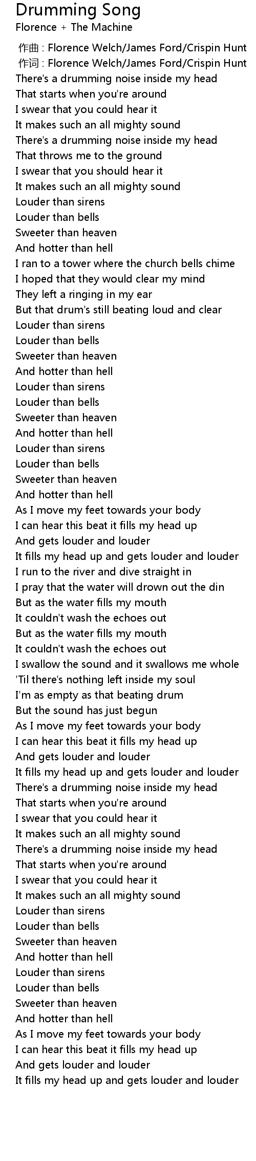 | [00:01.00] | zuo ci : Florence Welch James Ford Crispin Hunt |