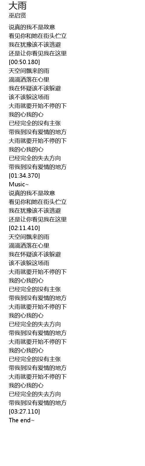 | [03:11.370] | dà yǔ jiù yào kāi shǐ bù tíng de xià |