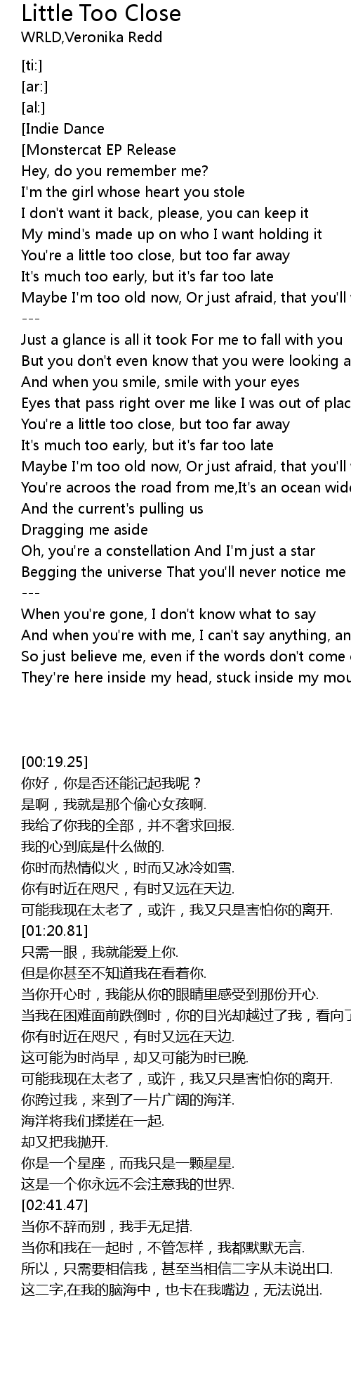 | [00:00.63][Indie Dance] | - WRLD - Little Too Close (feat. Veronika Redd) |