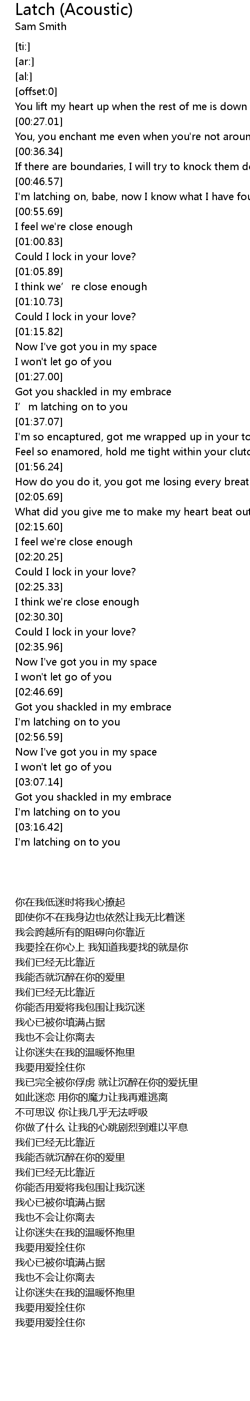| [03:21.99] | I' m latching on to you |