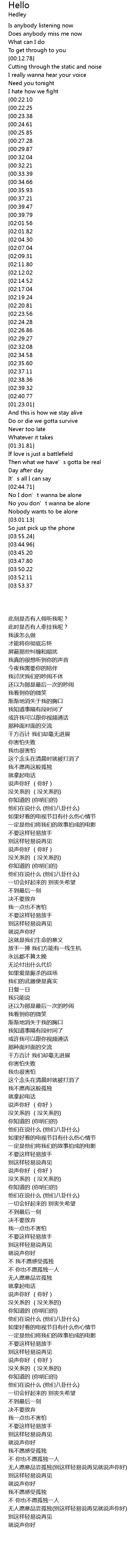 | [03:23.32][02:20.81][01:00.81] | Just say hello hello |