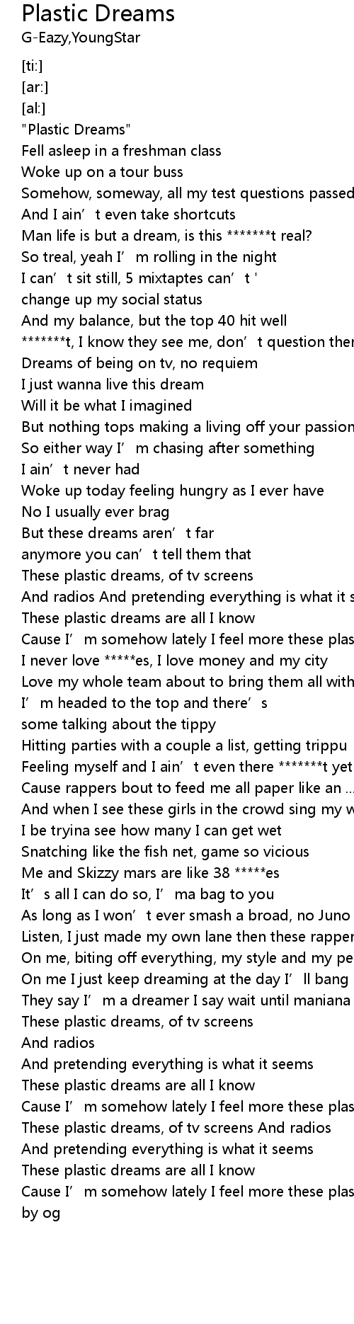 | [03:08.24] | Cause I’m somehow lately I feel more these plastic dreams |