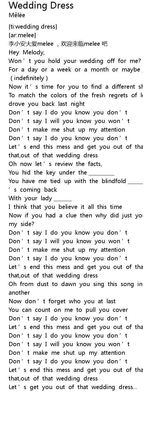 | [00:55.30] | Let ’s end this mess and get you out of that,out of that,out of that wedding dress |