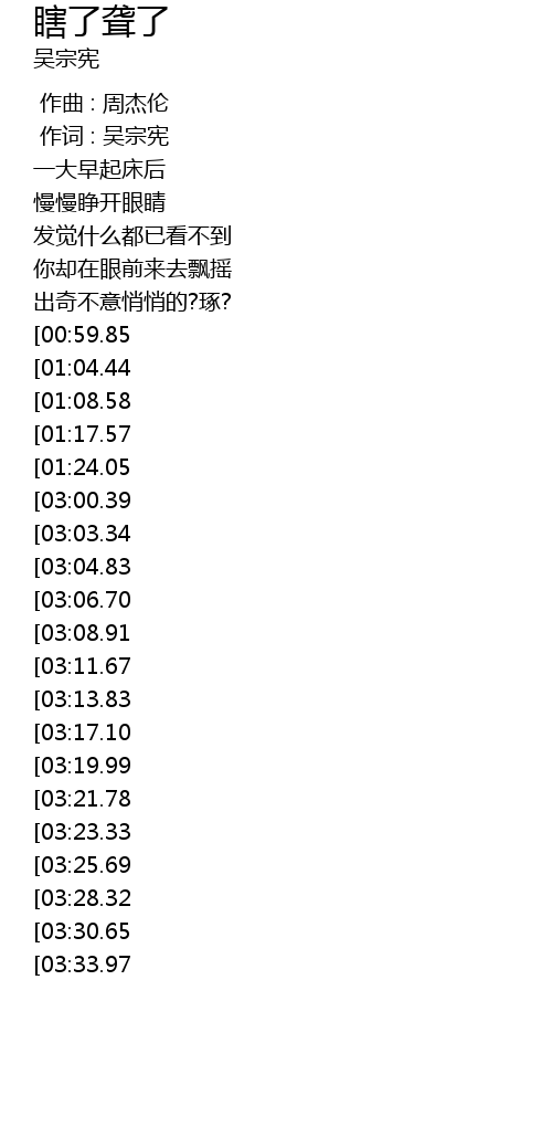 | [03:43.00][03:00.39][01:31.84] | 我是否瞎了袭了 |