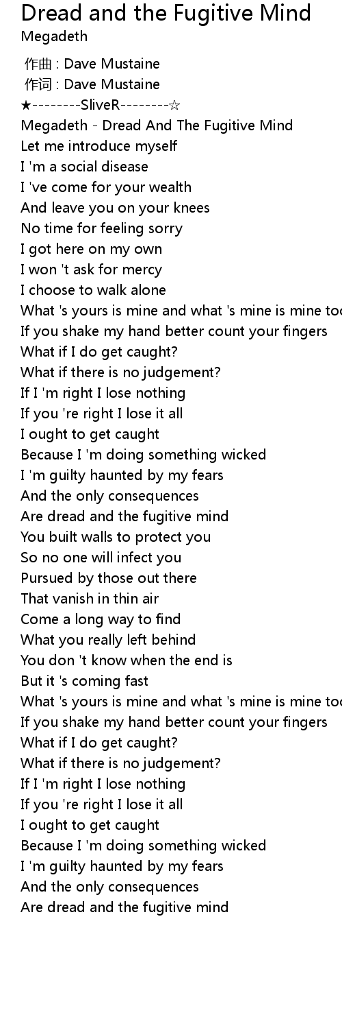 | [00:01.30] | Megadeth - Dread And The Fugitive Mind |