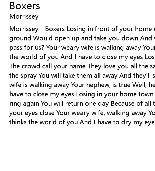 Morrissey - Boxers Losing in front of your home crowd You wish the ground Would open up and take you down And will time never pass? Will time never pass for us? Your weary wife is walking away Your nephew is true Well, he thinks the world of you And I have to close my eyes Losing in front of your home town The crowd call your name They love you all the same The sound, the smell, and the spray You will take them all away And they'll stay till the grave Your weary wife is walking away Your nephew, is true Well, he thinks the world of you And I have to close my eyes Losing in your home town Hell is the bell That will not ring again You will return one day Because of all the things that you see When your eyes close Your weary wife, walking away Your nephew, it's true He still thinks the world of you And I have to dry my eyes, oh |