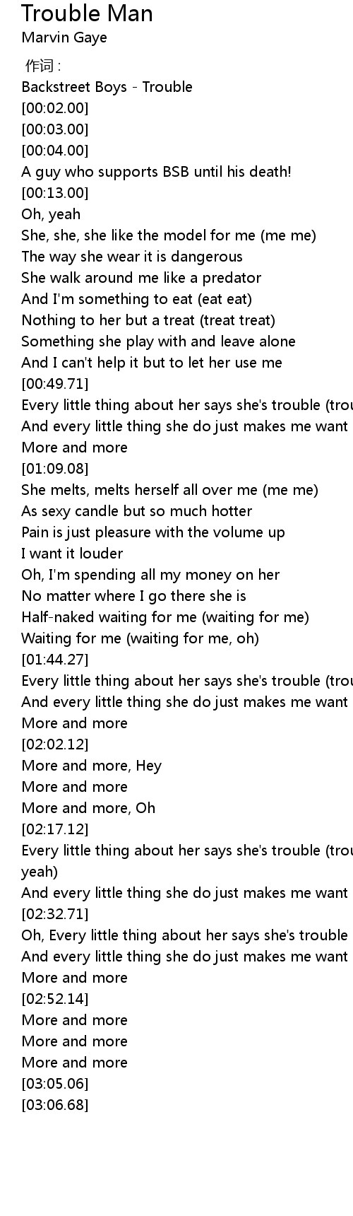 | [02:17.72] | Every little thing about her says she's trouble (trouble, trouble yeah) |