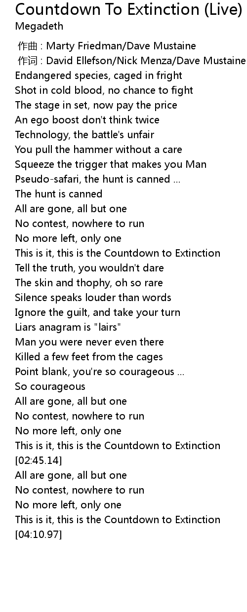 | [01:19.88] | This is it, this is the Countdown to Extinction |