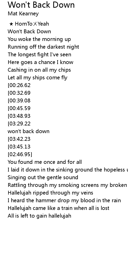 | [04:02.17][03:48.93][03:23.68][02:18.50][00:52.40] | And I won' t back down |