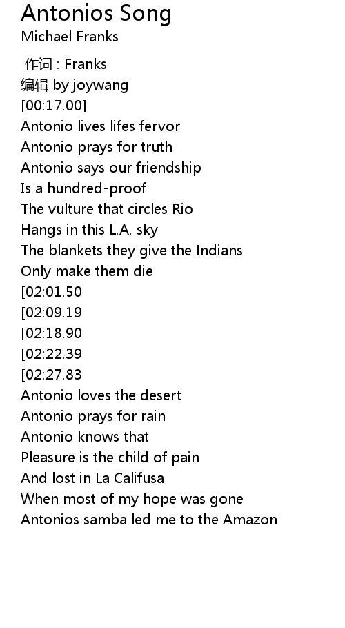 | [03:03.91] | Antonios samba led me to the Amazon |